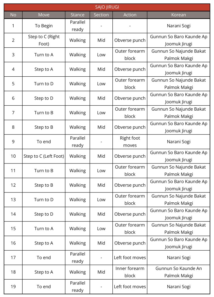 Sajo Jirugi is an introductory pattern that involves executing punches in four different directions. This pattern helps you understand how to maintain balance and proper form while turning and punching.